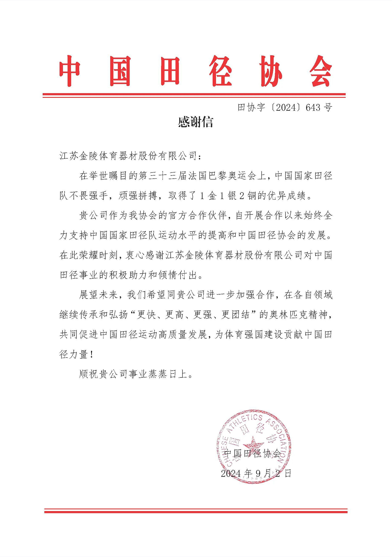 近日,中國(guó)田徑協(xié)會(huì)向金陵體育發(fā)來(lái)感謝信,感謝金陵體育為中國(guó)國(guó)家田徑隊(duì)奧運(yùn)爭(zhēng)光做出的貢獻(xiàn)。